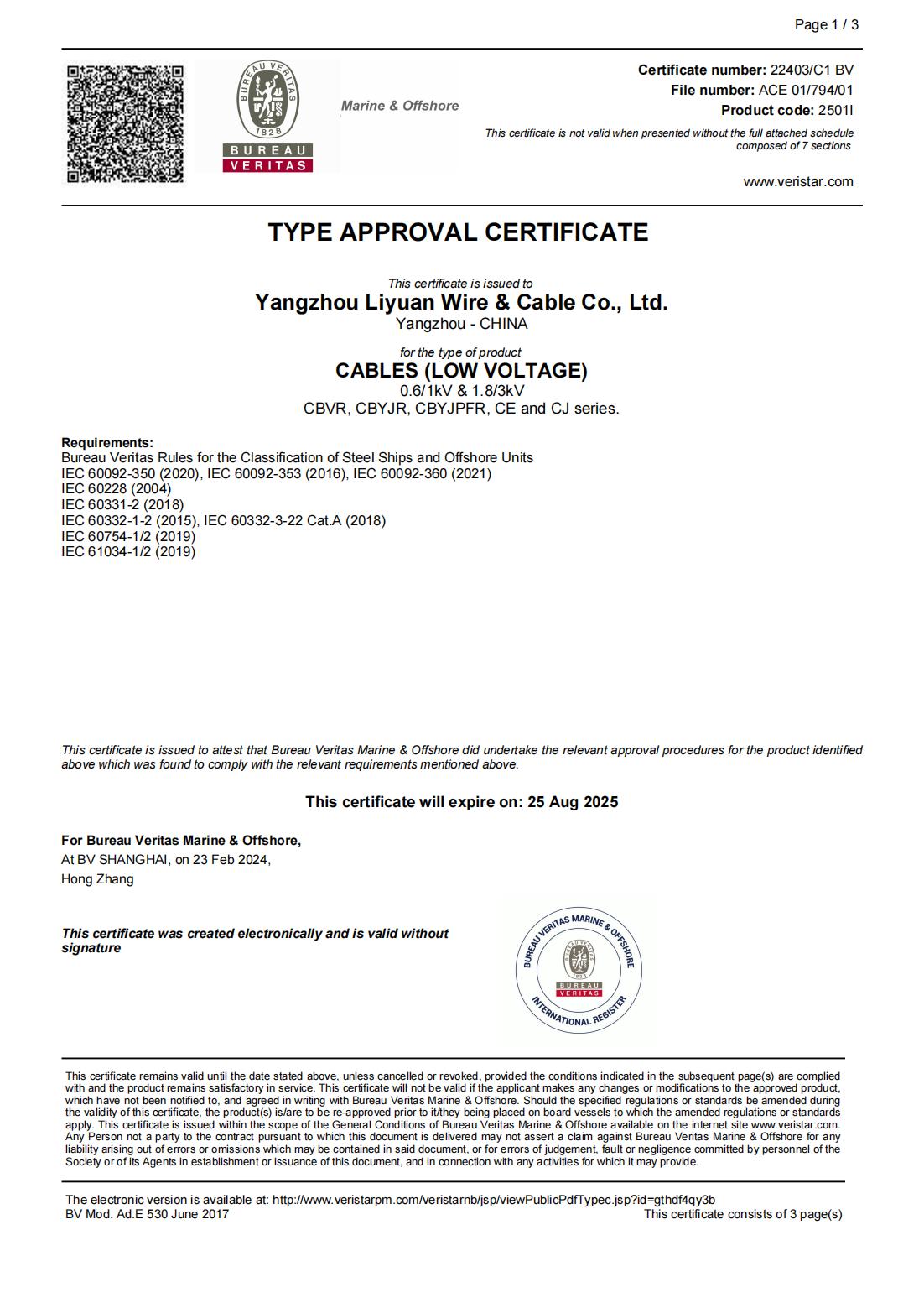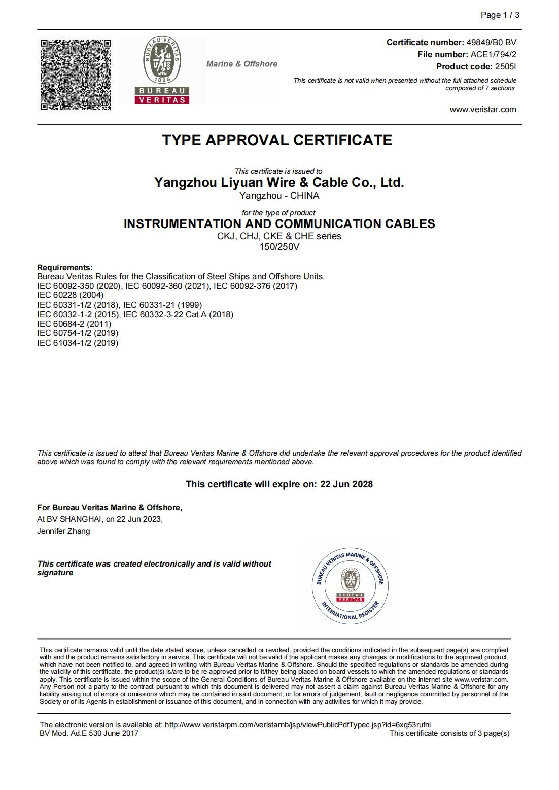 BV 分類協会証明書